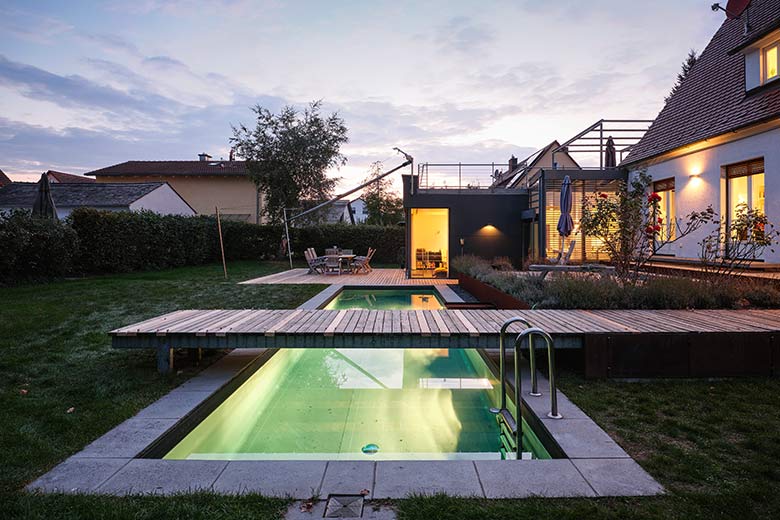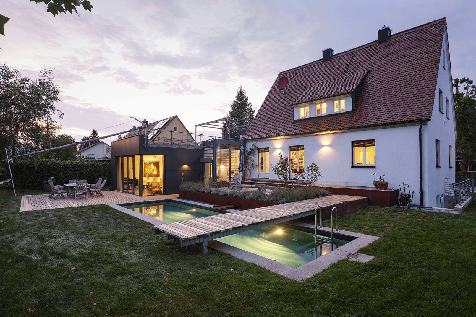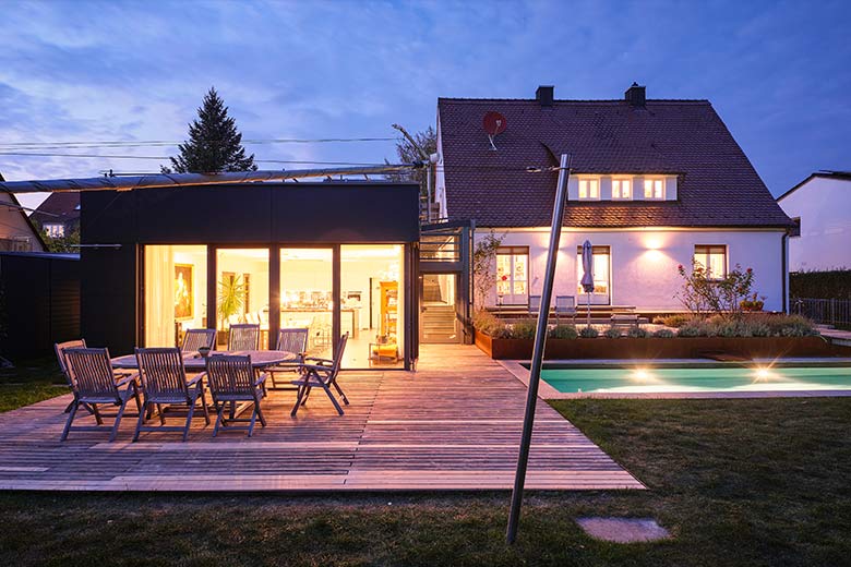 Das bestehende Siedlungshaus wurde komplett renoviert und durch einen modern gestalteten Anbau ergänzt.