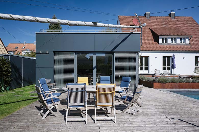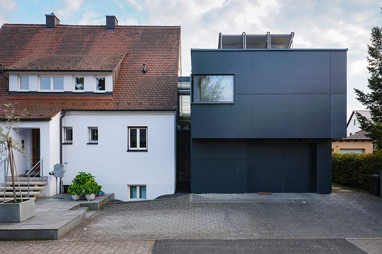 Der Neubau wurde durch einen verglasten Zwischengang mit dem alten Siedlungshaus verbunden und setzt durch seine kubische Form einen spannenden Kontrast zwischen Alt und Neu.
