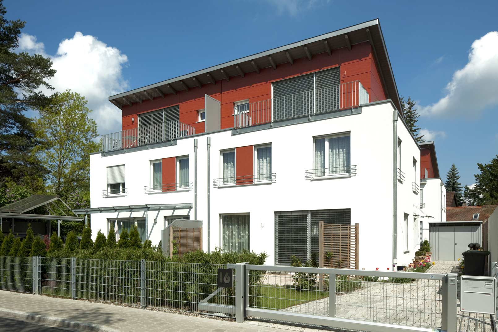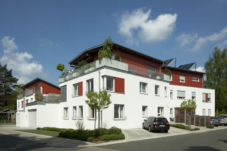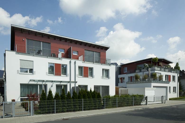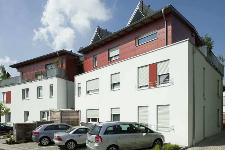 Eine Wohnanlage aus zwei Doppelhäusern und einem Mehrfamilienwohnhaus mit 4 Wohnungen und einem Penthaus als KfW 60-Häuser in konventioneller Bauweise.