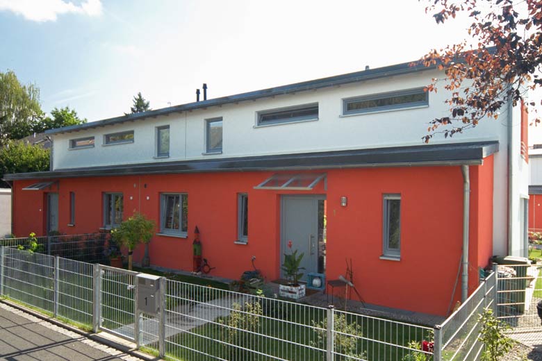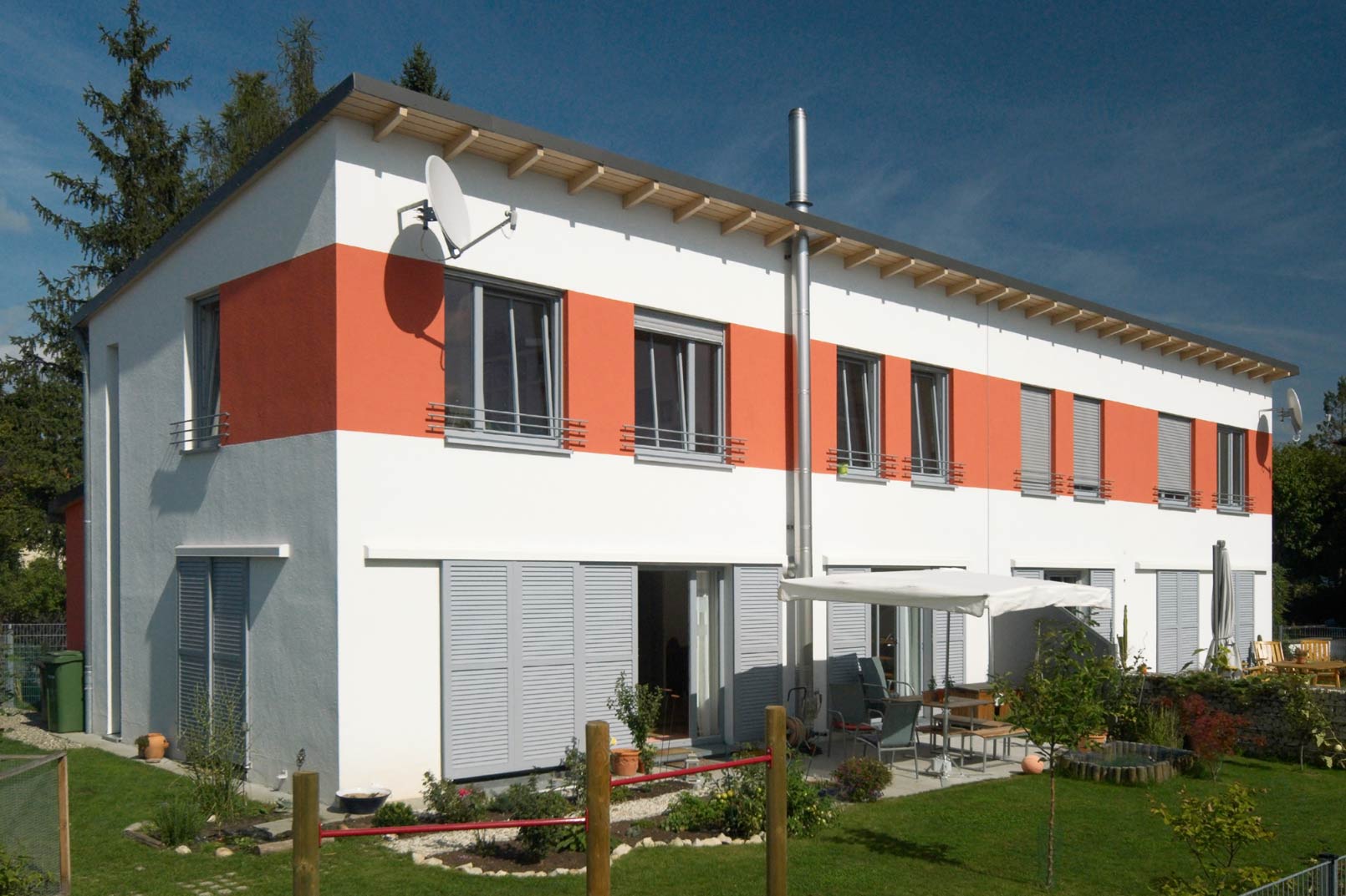 Eine kleine Wohnanlage mit einem Doppel- und drei Reihenhäusern entstanden hier auf einem Gründstück in einem bestehenden Baugebiet. Alle Wohn- und Schlafräume orientieren sich nach Südwest, die Nebenräume nach Nordost. Durch flexible Grundrissvarianten konnten für die Käufer individuell geplante Häuser realisiert werden.