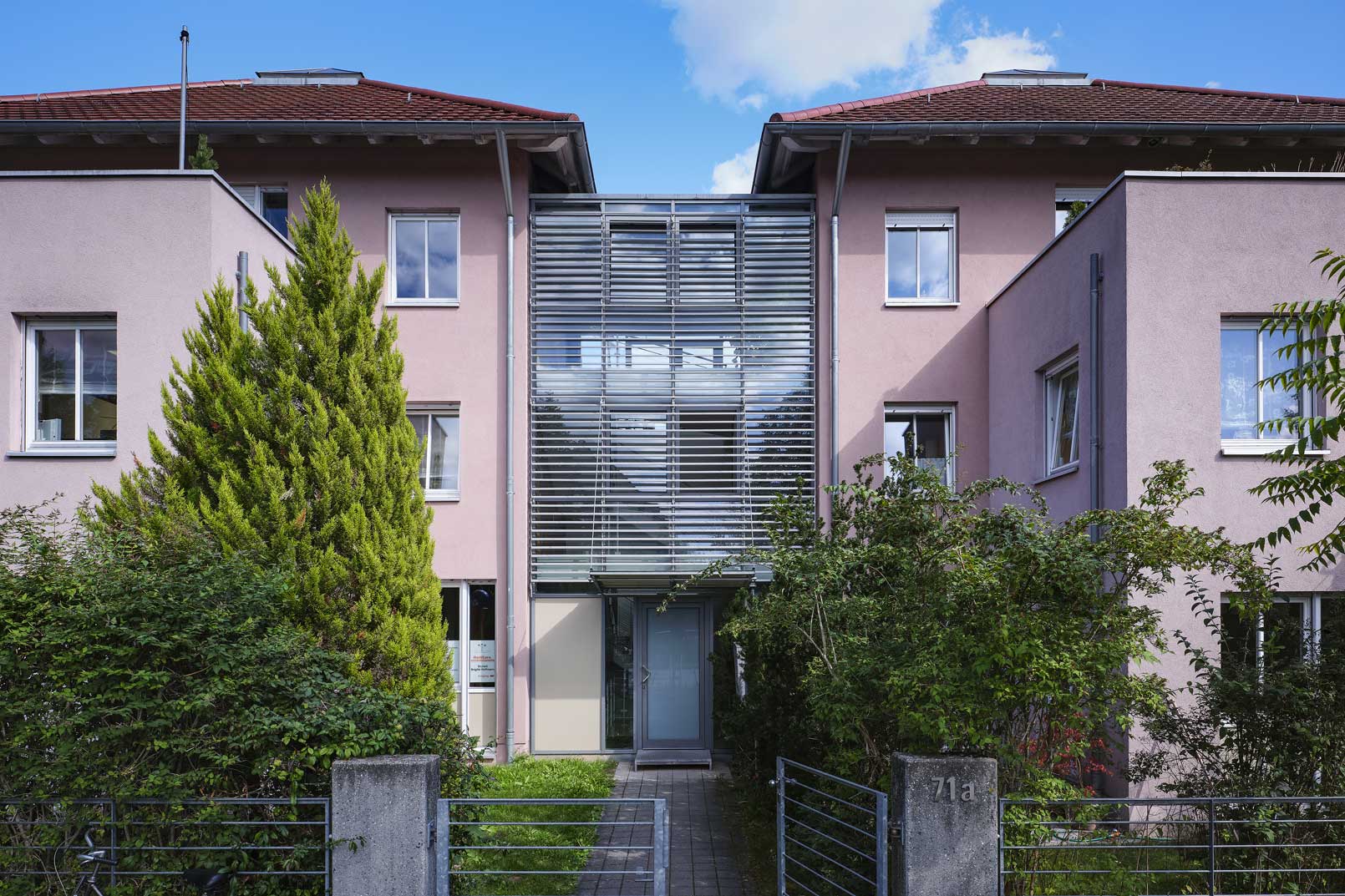 Das Gebäude bietet Platz für zwei Arztpraxen, sieben Wohnungen und eine Tiefgarage. Durch den Neubau in einem bestehenden, innerstädtischen alten Villenviertel ergab sich der Entwurf von zwei "Baukörpern" mit Zeltdächern, die durch das zwischenliegende, verglaste Treppenhaus miteinander verbunden sind. Die obergeschossigen Wohnungen erhielten großzügig nutzbare Dachterrassen.